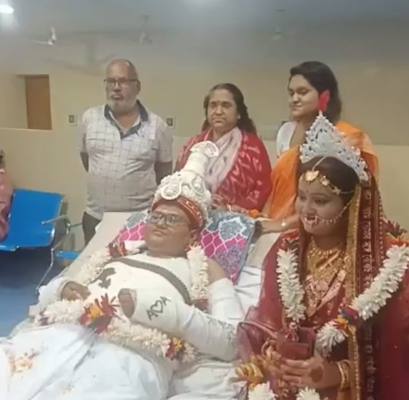 দুর্ঘটনায় আহত বর আনন্দ সাহার হাত-পা ব্যান্ডেজে বাঁধা অবস্থায় থাকলেও নির্ধারিত লগ্ন ভ্রষ্ট না করতে পরিবার ও হাসপাতাল কর্তৃপক্ষের সহায়তায় বিয়ের আয়োজন হয়।