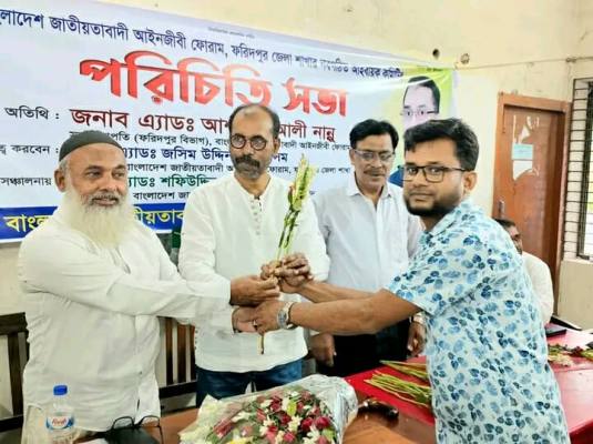ফরিদপুরে জাতীয়তাবাদী আইনজীবী ফোরামের জেলা শাখার নবগঠিত আহ্বায়ক কমিটির পরিচিতি সভা অনুষ্ঠিত হয়েছে। সোমবার (৮ সেপ্টেম্বর, ২০২৫) দুপুরে আইনজীবী সমিতির কার্যালয়ে অনুষ্ঠিত এই সভায় নবগঠিত কমিটির সর্বকনিষ্ঠ সদস্য, অ্যাডভোকেট হেমায়েত হোসেনকে ফুল দিয়ে বরণ করে নেওয়া হয়।