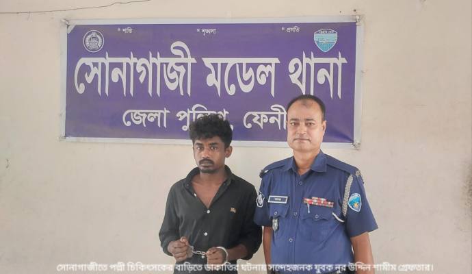 ফেনীর সোনাগাজীতে পল্লী চিকিৎসক ডা. শাহজাহান খানের বাড়িতে সংঘটিত ডাকাতির ঘটনায় নুর উদ্দিন শামীম (২৪) নামে এক সন্দেহভাজন যুবককে গ্রেফতার করেছে পুলিশ। তিনি সোনাগাজী সদর ইউনিয়নের ছাড়াইত কান্দি গ্রামের গণু হাফেজের বাড়ির জামাল উদ্দিনের ছেলে।