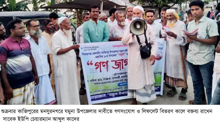 সিরাজগঞ্জের কাজিপুর উপজেলার যমুনা নদীর চরাঞ্চলে অবস্থিত ছয়টি ইউনিয়ন নিয়ে নতুন ‘যমুনা উপজেলা’ গঠনের দাবিতে গণসংযোগ ও লিফলেট বিতরণ কর্মসূচি অনুষ্ঠিত হয়েছে।