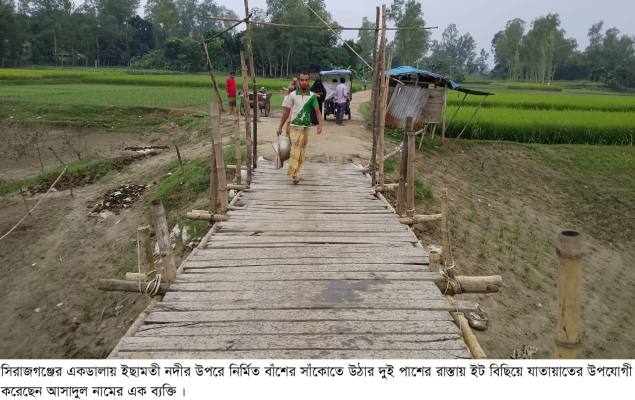 সংসদীয় আসন সিরাজগঞ্জ-১ (কাজিপুর ও সদর উপজেলার চার ইউনিয়ন) এলাকার একডালা গ্রামে বহমান ইছামতী নদী পারাপারের জন্য কয়েক মাস আগে স্থানীয় উদ্যোগে প্রায় ২০০ ফুট দীর্ঘ একটি বাঁশের সাঁকো নির্মাণ করা হয়। তবে সাঁকোয় ওঠার দুইপাশের রাস্তা ভেঙে গিয়ে তা চলাচলের অনুপযোগী হয়ে পড়েছিল। সম্প্রতি স্থানীয় যুবক আসাদুল ইসলাম নিজ উদ্যোগে প্রায় দুই লাখ টাকা ব্যয়ে পূর্বপাড়ের দেড়শ ফুট এবং পশ্চিমপাড়ের আড়াইশ ফুট রাস্তা ইট বিছিয়ে মেরামত করেন।