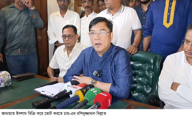 জামালপুর জেলা বিএনপির কোষাধ্যক্ষ ও সাবেক সংসদ সদস্য এম রশিদুজ্জামান মিল্লাত বলেছেন, “জামায়াত ইসলাম বিক্রি করে ভোট করতে চায়, আর আমরা ইসলামী শক্তিতে বিশ্বাস করি।”
