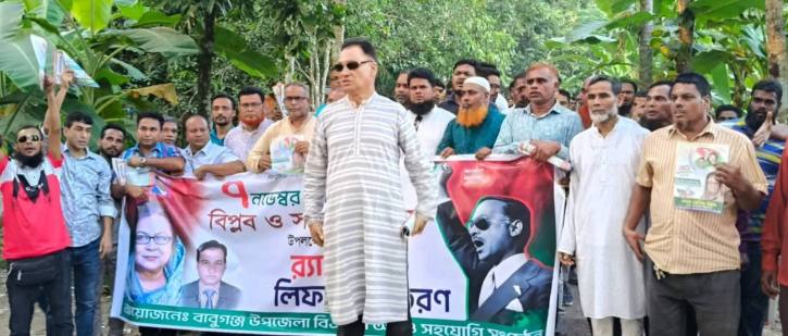 ঐতিহাসিক ৭ নভেম্বর জাতীয় বিপ্লব ও সংহতি দিবস উপলক্ষে শনিবার (৮ নভেম্বর) বিকেল ৪টায় বাবুগঞ্জ উপজেলা বিএনপির উদ্যোগে বর্ণাঢ্য র্যালি ও লিফলেট বিতরণ কর্মসূচি অনুষ্ঠিত হয়েছে। উপজেলার মাধবপাশা ইউনিয়নের ৩নং ওয়ার্ডে আয়োজিত এ কর্মসূচিতে বিএনপি, যুবদল, স্বেচ্ছাসেবক দল, কৃষক দল, শ্রমিক দল, ছাত্রদলসহ বিভিন্ন অঙ্গ ও সহযোগী সংগঠনের নেতৃবৃন্দ অংশগ্রহণ করেন।