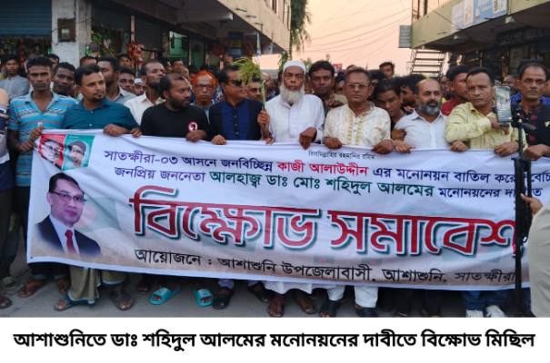 সাতক্ষীরা-৩ (আশাশুনি-কালিগঞ্জ) আসনে ডাঃ শহিদুল আলমের মনোনয়ন দেওয়ার ও কাজী আলাউদ্দীনের মনোনয়ন বাতিলের দাবিতে আশাশুনিতে রবিবার (৯ অক্টোবর) বিকেলে বিক্ষোভ মিছিল ও সমাবেশ অনুষ্ঠিত হয়েছে।