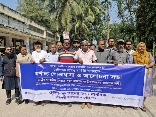 সুশাসনের জন্য নাগরিক সুজনের ২৩তম প্রতিষ্ঠা বার্ষিকী উপলক্ষে বরিশালের গৌরনদীতে বর্ণাঢ্য র্যালি ও আলোচনা সভা অনুষ্ঠিত হয়েছে।