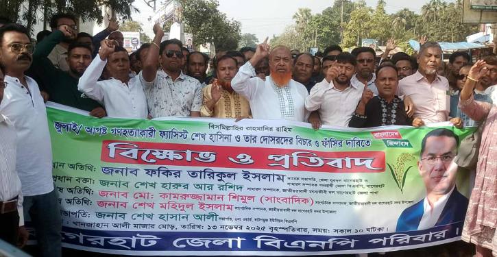 শেখ হাসিনার ফাঁসির দাবিতে বাগেরহাট বিএনপির বিক্ষোভ ও সমাবেশ