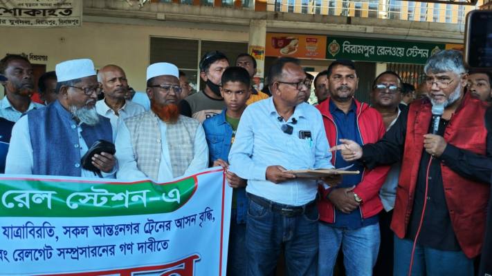 দিনাজপুরের বিরামপুর রেলস্টেশনে পঞ্চগড় এক্সপ্রেস ও কুড়িগ্রাম এক্সপ্রেস ট্রেনের যাত্রাবিরতি নিশ্চিতকরণ, সকল আন্তঃনগর ট্রেনে আসনসংখ্যা বৃদ্ধি, রেলস্টেশনে স্থায়ী পুলিশ ফাঁড়ি স্থাপন এবং ঝুঁকিপূর্ণ রেলগেট সম্প্রসারণের দাবিতে মানববন্ধন ও বিক্ষোভ সমাবেশ অনুষ্ঠিত হয়েছে।