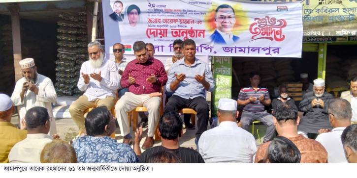 বিএনপির ভারপ্রাপ্ত চেয়ারম্যান তারেক রহমানের ৬১তম জন্মবার্ষিকী উপলক্ষে জামালপুরে দোয়া মাহফিল অনুষ্ঠিত হয়েছে। বৃহস্পতিবার (২০ নভেম্বর) দুপুরে শহরের স্টেশন রোডস্থ জেলা বিএনপির দলীয় কার্যালয়ের সামনে এ আয়োজন করে জামালপুর জেলা বিএনপি।