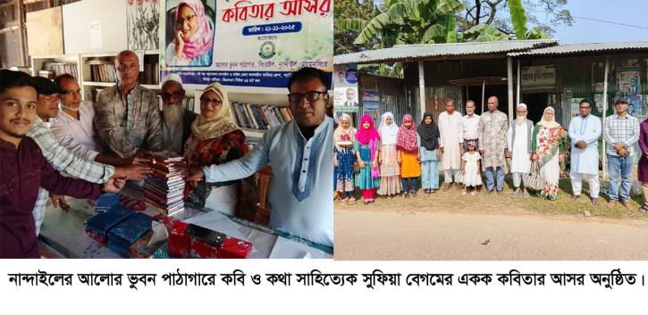 ময়মনসিংহের নান্দাইল উপজেলার সিংরইল গ্রামে আলোর ভুবন পাঠাগারের উদ্যোগে কবি ও কথাসাহিত্যিক সুফিয়া বেগমের একক কবিতা আসর অনুষ্ঠিত হয়েছে। শুক্রবার অনুষ্ঠিত এ আয়োজনে প্রধান অতিথি হিসেবে উপস্থিত ছিলেন প্রাণিসম্পদ অধিদফতরের সাবেক মহাপরিচালক শহীদুল ইসলাম।