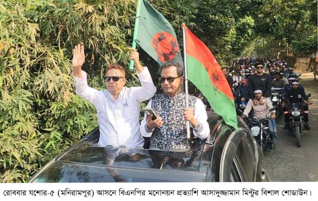 হাজারো কর্মী-সমর্থকদের মোটরসাইকেল বহর নিয়ে দিনভর উপজেলার প্রধান প্রধান হাট-বাজারের উপর দিয়ে বিশাল শোডাউন দিলেন আসাদুজ্জামান মিন্টু। এক হাতে জাতীয় পতাকা আরেক হাত নাড়িয়ে রাস্তার দু’ধারে দাড়িয়ে থাকা উৎসুক জনতাকে শুভেচ্ছা জানাতে দেখা যায় তাকে। তিনি যশোরের মনিরামপুর উপজেলা বিএনপির সাধারণ সম্পাদক এবং যশোর-৫ (মনিরামপুর) আসনে ধানের শীষের মনোনয়ন প্রত্যাশি।