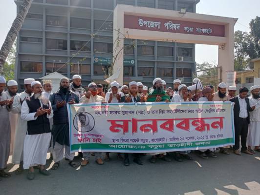 মহানবী হযরত মুহাম্মদ (সাঃ) ও তার প্রিয় সহধর্মিনীদের নিয়ে অশ্লীল বক্তব্য লেখুনির প্রতিবাদে বাগেরহাটের কচুয়ায় মানববন্ধন অনুষ্ঠিত হয়েছে।