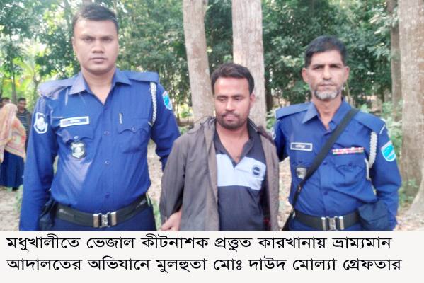 ফরিদপুরের মধুখালীতে অবৈধভাবে ভেজাল সার ও কীটনাশক উৎপাদন ও বাজারজাত করার অভিযোগে দাউদ মোল্লা (৩৫) নামে এক যুবককে এক বছরের সশ্রম কারাদণ্ড ও এক লাখ টাকা জরিমানা করেছেন ভ্রাম্যমাণ আদালত। জরিমানা অনাদায়ে তাকে আরও তিন মাসের কারাদণ্ড ভোগ করতে হবে।