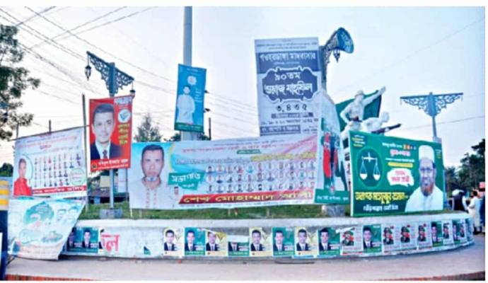 খুলনা নগরীর ব্যস্ততম শিববাড়ী মোড়ে ‘অর্জন’ নামের মুক্তিযুদ্ধভিত্তিক ভাস্কর্য একসময় ছিল দৃষ্টিনন্দন। চারপাশে গড়া হয়েছিল ফুলের বাগানও। তবে কয়েক মাস ধরে প্রার্থী ও সমর্থকদের বেপরোয়া প্রচারণায় সেই সৌন্দর্য এখন প্রায় আড়ালে।