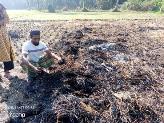 স্থানীয়রা জানান, ক্ষতিগ্রস্ত কৃষক রাজু পেশায় একজন ভাঙাড়ি ব্যবসায়ী। সংসারের বাড়তি আয় ও সন্তানদের পড়াশোনার খরচ চালাতে তিনি ১০ কাঠা জমি বন্ধক নিয়ে চাষাবাদ করছিলেন। নিজের শ্রম আর পরিবার-পরিজনের কষ্ট দিয়ে উৎপাদিত ধান কয়েকদিন ধরে কাটার পর মাঠে শুকানোর জন্য রাখা ছিল।