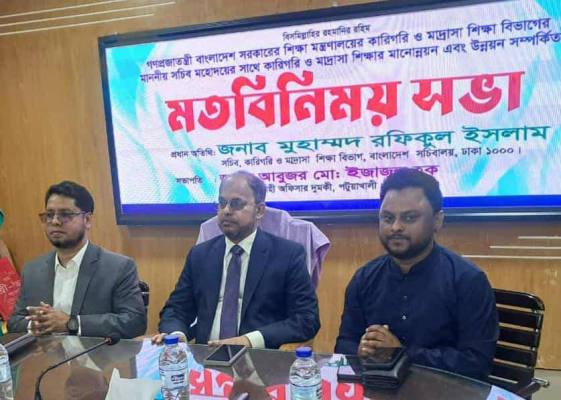 পটুয়াখালীর দুমকিতে কারিগরি ও মাদ্রাসা শিক্ষার গুণগত মানোন্নয়নের লক্ষ্যে শিক্ষা মন্ত্রণালয়ের কারিগরি ও মাদ্রাসা শিক্ষা বিভাগের সচিবের সাথে উপজেলা পর্যায়ের প্রতিষ্ঠান প্রধানদের এক গুরুত্বপূর্ণ মতবিনিময় সভা অনুষ্ঠিত হয়েছে।