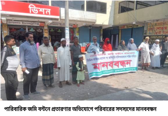 সাতক্ষীরা সদর উপজেলার ফিংড়ী ইউনিয়নের জোড়দিয়ায় পারিবারিক জমি বন্টনে প্রতারণার অভিযোগে বঞ্চিত পরিবারের সদস্যরা মানববন্ধন করেছেন। শুক্রবার (২৮ নভেম্বর) বুধহাটা করিম সুপার মার্কেট রাস্তায় অনুষ্ঠিত মানববন্ধনে স্থানীয়রা অংশ নেন।