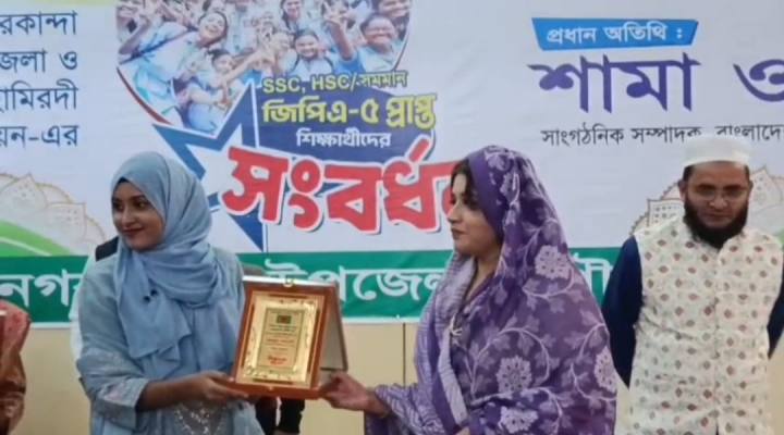 ফরিদপুরের নগরকান্দা উপজেলায় এসএসসি ও এইচএসসি পরীক্ষায় জিপিএ ফাইভ প্রাপ্ত কৃতি শিক্ষার্থীদের সংবর্ধনা প্রদান করা হয়েছে। শুক্রবার (২৮ নভেম্বর) বিকেলে উপজেলা পাবলিক অডিটোরিয়ামে অনুষ্ঠিত এই অনুষ্ঠানে প্রধান অতিথি হিসেবে উপস্থিত ছিলেন বিএনপির কেন্দ্রীয় কমিটির বিভাগীয় সাংগঠনিক সম্পাদক শামা ওবায়েদ ইসলাম।