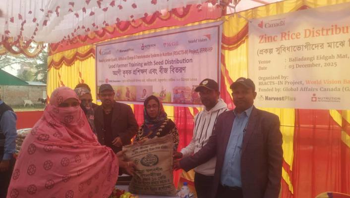 জিংক সমৃদ্ধ ধান চাষে কৃষকদের উদ্বুদ্ধ করনের লক্ষ্যে আজ বুধবার (৩ ডিসেম্বর, ২০২৫) ঠাকুরগাঁও জেলার বালিয়াডাঙ্গী উপজেলার বড়বাড়ি ইউনিয়ন পরিষদ ও বালিয়াডাঙ্গী কেন্দ্রীয় ঈদগাহ মাঠে ওয়ার্ল্ড ভিশন বাংলাদেশ ও আরডিআর এস বাংলাদেশ এর আয়োজনে অগ্রণী কৃষক প্রশিক্ষণ ও বীজ বিতরণ অনুষ্ঠানের আয়োজন করা হয়।