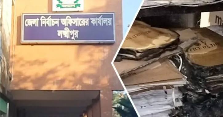 লক্ষ্মীপুর জেলা নির্বাচন কার্যালয়ের নিচতলার স্টোর রুমে পেট্রোল ঢেলে আগুন দিয়েছেন এক যুবক। সিসিটিভির ফুটেজে মাস্ক পরিহিত ওই যুবককে দেওয়াল টপকে কার্যালয়ের ঢুকতে ও বের হতে দেখা যায়।