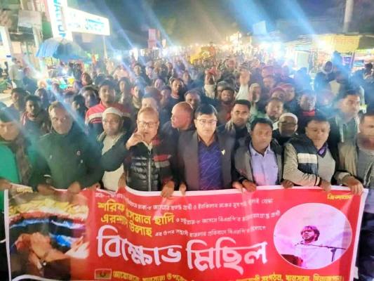 ছবির ক্যাপশন: হাদি ও এরশাদের হামলার প্রতিবাদে দিনাজপুরের খানসামায় বিএনপির বিক্ষোভ মিছিল।