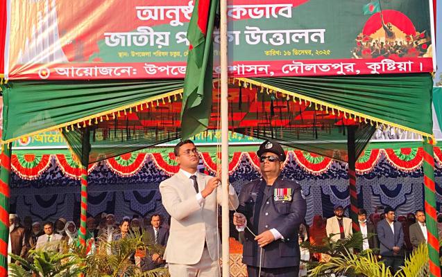 কুষ্টিয়ার দৌলতপুরে যথাযথ মর্যাদায় মহান বিজয় দিবস উদযাপন করা হয়েছে। আজ মঙ্গলবার বিজয়ের প্রত্যুষে সূর্যোদয়ের সাথে সাথে ৩১বার তোপধ্বনির মধ্যদিয়ে দিবসের সুচনা করা হয়।