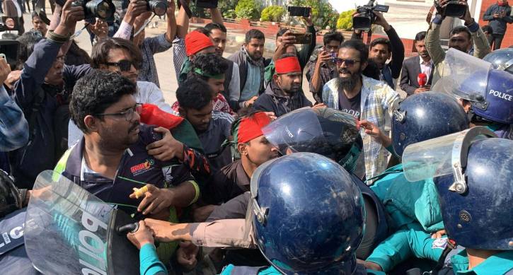 এসময় পুলিশ বাধা দিলে বিক্ষোভকারীদের সঙ্গে পুলিশের ব্যাপক ধ্বস্তাধস্তির ঘটনা ঘটে।