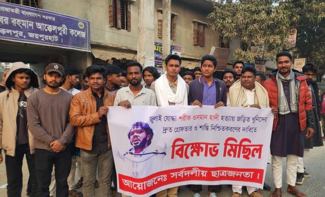 জয়পুরহাটের আক্কেলপুরে ইনকিলাব মঞ্চের মুখপাত্র শরিফ ওসমান হাদির হত্যার প্রতিবাদে শিক্ষার্থী ও সাধারণ জনগণের উদ্যোগে বিক্ষোভ মিছিল অনুষ্ঠিত হয়েছে।