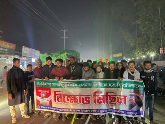 ইনকিলাব মঞ্চের মুখপাত্র শরীফ ওসমান হাদীকে হত্যার প্রতিবাদে শুক্রবার রাতে বিক্ষোভ মিছিল বের করে বাংলাদেশ জাতীয়তাবাদী ছাত্রদল বকশীগঞ্জ উপজেলা পৌর ও কলেজ শাখার নেতৃবৃন্দ।