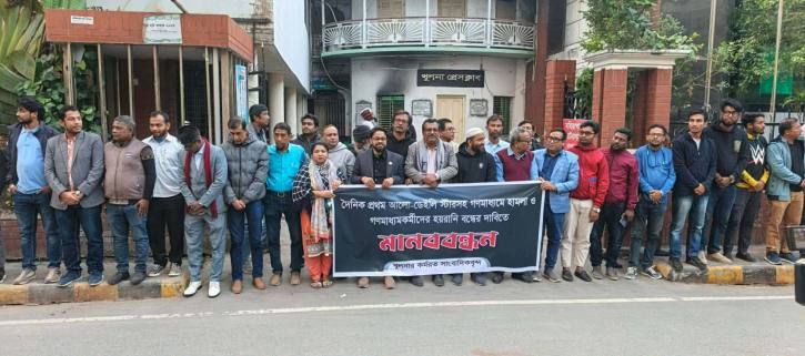 লেখক, সাংবাদিক ও গবেষক গৌরাঙ্গ নন্দীর সভাপতিত্বে মানববন্ধনে বক্তারা বলেন, এই হামলা কোনো একটি গণমাধ্যমকে লক্ষ্য করে নয়; এটি স্বাধীন সাংবাদিকতা, মতপ্রকাশের স্বাধীনতা এবং দেশের গণতান্ত্রিক কাঠামোর ওপর সরাসরি আঘাত।
