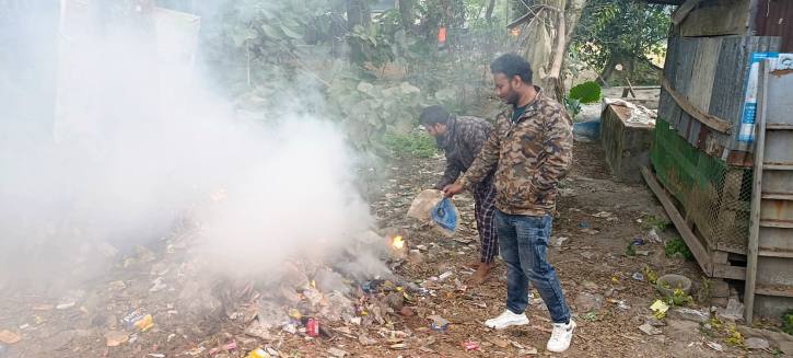 উপজেলার পাংগাশিয়া ইউনিয়নের ধোপারহাট বাজারে যত্রতত্র ছড়িয়ে-ছিটিয়ে থাকা পলিথিন ও প্লাস্টিক বর্জ্য নিজ হাতে পরিষ্কার করে পুড়িয়ে ফেলেছেন তারা।