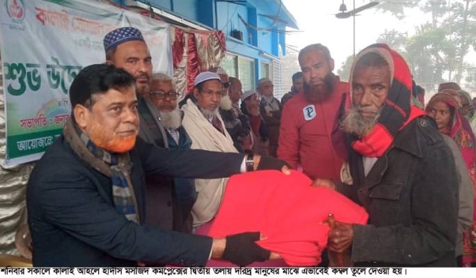 শনিবার (২৭ ডিসেম্বর) সকাল ১১টায় কালাই আহলে হাদীস মসজিদ কমপ্লেক্সের দ্বিতীয় তলায় পৌরসভার ৯টি ওয়ার্ডের শতাধিক দরিদ্র ও শীতার্ত মানুষের মাঝে শীত নিবারণের জন্য কম্বল বিতরণ করা হয়। কালাই সোশ্যাল অর্গানাইজেশনের পরিচালক আবুল হাসনাত সরকার বাবষলা নিজস্ব অর্থায়নে এসব কম্বল বিতরণ করেন।