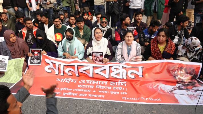 সেখানে বসে অবস্থান নেন তারা। এতে কুষ্টিয়া-ঝিনাইদহ ও ঈশ্বরদী মহাসড়কে যানবাহন চলাচল বন্ধ হয়ে যায়। এসময় বিক্ষোভকারীরা ভারত ও আওয়ামী লীগ বিরোধী বিভিন্ন স্লোগান দেন এবং হাদি হত্যার সঙ্গে জড়িতদের কঠোর বিচার দাবি করেন।