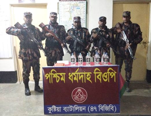 বিজিবি সূত্র জানায়, সুনির্দিষ্ট গোয়েন্দা তথ্যের ভিত্তিতে রবিবার রাত ১১টার দিকে কুষ্টিয়া ব্যাটালিয়ন (৪৭ বিজিবি) এর অধীনস্থ পশ্চিম ধর্মদাহ বিওপির দায়িত্বপূর্ণ এলাকার সীমান্ত পিলার ১৪৭/৪-এস হতে আনুমানিক ১৫০ গজ বাংলাদেশের অভ্যন্তরে পশ্চিম ধর্মদাহ মাঠে নায়েক মো. দাউদ হোসেন এর নেতৃত্বে বিজিবি’র টহল দল অভিযান চালিয়ে মালিকবিহীন অবস্থায় ভারতীয় ১৫ বোতল মদ ও ৩৯৫ পিস সিলডিনাফিল ট্যাবলেট উদ্ধার করে।