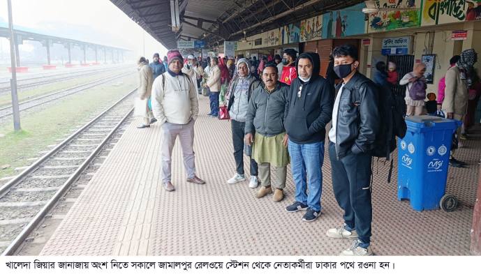 তীব্র শীত উপেক্ষা করে জামালপুর জেলা থেকে প্রায় ৩০ হাজার নেতাকর্মী বেগম খালেদা জিয়ার জানাজায় অংশ নেবেন বলে জেলা বিএনপির পক্ষ থেকে জানানো হয়েছে। জামালপুর টাউন রেলওয়ে জংশনসহ জেলার বিভিন্ন স্টেশন থেকে আন্তঃনগর তিস্তা এক্সপ্রেস, যমুনা এক্সপ্রেস, জামালপুর এক্সপ্রেস, অগ্নিবীণা এক্সপ্রেস, ব্রহ্মপুত্র এক্সপ্রেস ও বেসরকারি দুটি কমিউটার ট্রেনে করে নেতাকর্মী ও সাধারণ মানুষ ঢাকায় যাচ্ছেন।