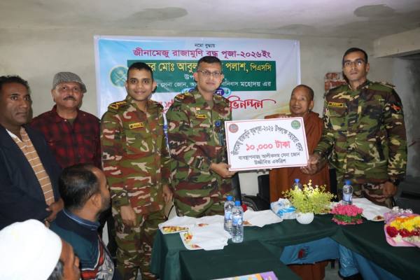 পার্বত্য অঞ্চলে সাম্প্রদায়িক সম্প্রীতি, মানবিক সহায়তা ও সামাজিক উন্নয়নের ধারাবাহিকতায় আলীকদম সেনা জোন জীনামেজু বুদ্ধপূজা-২০২৬ উপলক্ষে আর্থিক ও মানবিক সহায়তা প্রদান করেছে।