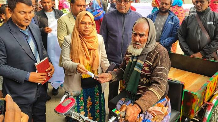 রাজশাহীর দুর্গাপুরে প্রতিবন্ধী ক্ষুদ্র সবজি ব্যবসায়ী খোদাবক্স-কে ট্রাইসাইকেল দিয়েছেন উপজেলা সমাজসেবা কার্যালয়।