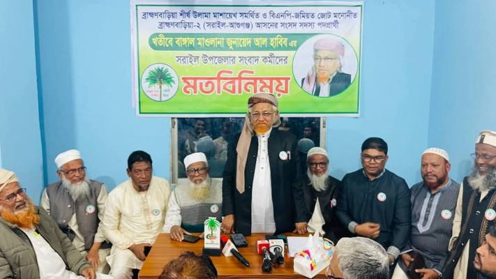 ব্রাহ্মণবাড়িয়ার সরাইলে সাংবাদিকদের সঙ্গে মতবিনিময় করেছেন ব্রাহ্মণবাড়িয়া-২ (সরাইল-আশুগঞ্জ ও বিজয়নগর একাংশ ) আসনের বিএনপির নেতৃত্বাধীন জোটের মনোনীত প্রার্থী জমিয়তে উলামায়ে ইসলাম বাংলাদেশ এর কেন্দ্রীয় কমিটির সহ-সভাপতি মাওলানা জুনায়েদ আল হাবিব।