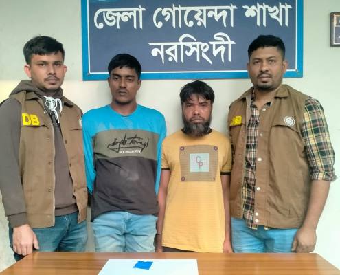 গ্রেফতারকৃতরা হলেন— মো: শফি উল্লাহ (৪১), পিতা আনোয়ার হোসেন এবং মো: জাহিদ খাঁন (৩৩), পিতা মো: কামাল খান। উভয়েই নরসিংদী সদর মডেল থানার বাদুয়ারচর এলাকার বাসিন্দা।
