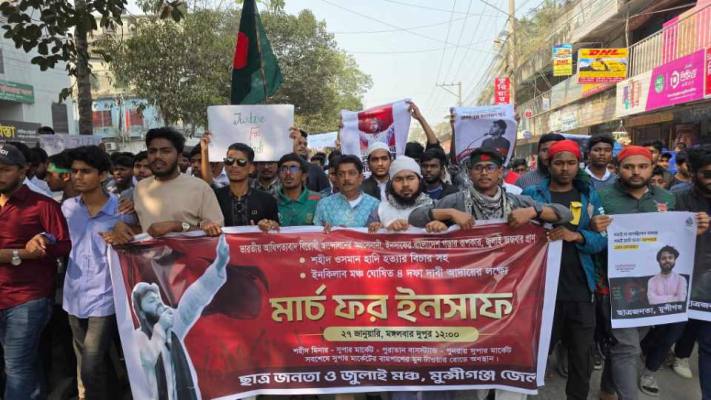 শহিদ শরিফ ওসমান বিন হাদিকে গুলি করে হত্যার ঘটনায় সর্বোচ্চ বিচার নিশ্চিতের দাবিতে মুন্সীগঞ্জ শহরে ‘মার্চ ফর ইনসাফ’ কর্মসূচি পালন করেছে ‘ছাত্র-জনতা’।
