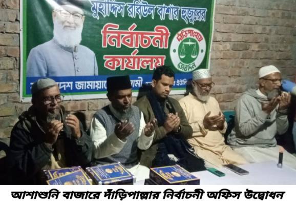 আশাশুনি সদর বাজারে ১১ দলীয় জোট ও জামায়াত মনোনীত এমপি প্রার্থী মুহাদ্দিস রবিউল বাশারের দাঁড়িপাল্লা প্রতিকের নির্বাচনী অফিস উদ্বোধন ও পথসভা অনুষ্ঠিত হয়েছে। অনুষ্ঠান রবিবার (১ ফেব্রুয়ারি) সন্ধ্যায় সদর ইউনিয়ন জামায়াতের উদ্যোগে আয়োজন করা হয়।