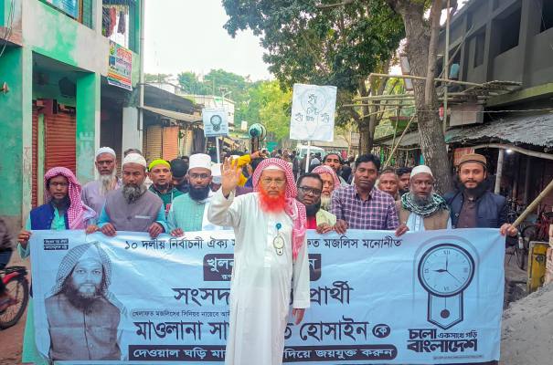 খুলনা-৪ আসনের দেওয়াল ঘড়ি প্রতীকের সংসদ সদস্য প্রার্থী, খেলাফত মজলিসের সিনিয়র নায়েবে আমীর মাওলানা সাখাওয়াত হোসাইন রোববার (১ ফেব্রুয়ারি) খুলনার দিঘলিয়া উপজেলায় ব্যাপক নির্বাচনী গণসংযোগ করেছেন।