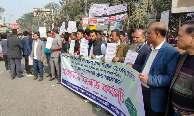 আজ সোমবার (২ ফেব্রুয়ারি)সকালে জেলা প্রশাসকের কার্যালয় থেকে একটি বিক্ষোভ মিছিল বের করা হয় এবং জেলা প্রশাসকের কার্যালয় প্রাঙ্গণ প্রদক্ষিণের পর প্রধান সড়কে মানববন্ধন অনুষ্ঠিত হয়। এ সময় বক্তারা বলেন, সরকারি কর্মচারীদের পে-স্কেল বাস্তবায়নে সরকার দীর্ঘদিন ধরে টালবাহানা করছে। নিত্যপ্রয়োজনীয় দ্রব্যমূল্যের বাজারে বেতন দিয়ে পরিবার চালানো কষ্টসাধ্য। তারা হুঁশিয়ারি দিয়েছেন, এবার দাবি বাস্তবায়ন না হলে আরও কঠোর আন্দোলন হবে।