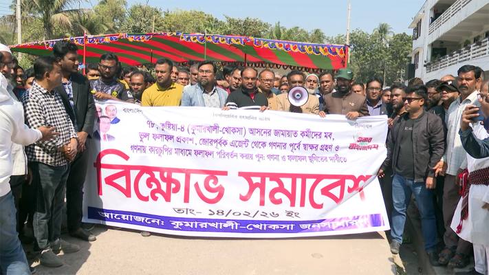 কুষ্টিয়া-৪ (কুমারখালী-খোকসা) আসনে ভোট পুনঃগণনার দাবিতে বিএনপি প্রার্থীর কর্মী ও সমর্থকরা শনিবার বেলা সাড়ে ১১টায় বিক্ষোভ মিছিল করেছেন। কুমারখালী ও খোকসা উপজেলার বিভিন্ন এলাকা থেকে অংশ নেওয়া বিক্ষোভকারীরা কুষ্টিয়া জেলা রিটার্নিং কর্মকর্তার কার্যালয় ঘেরাও করে ভোট ফলাফল নিয়ে অসন্তোষ প্রকাশ করেন।
