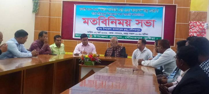 দৌলতপুর উপজেলা প্রশাসন এ মতবিনিময় সভার আয়োজন করেছে। সভায় বর্তমান প্রকল্প বাস্তবায়ন, ভবিষ্যৎ উন্নয়ন পরিকল্পনা এবং প্রশাসনিক কার্যক্রম নিয়ে বিস্তারিত আলোচনা করা হয়।
