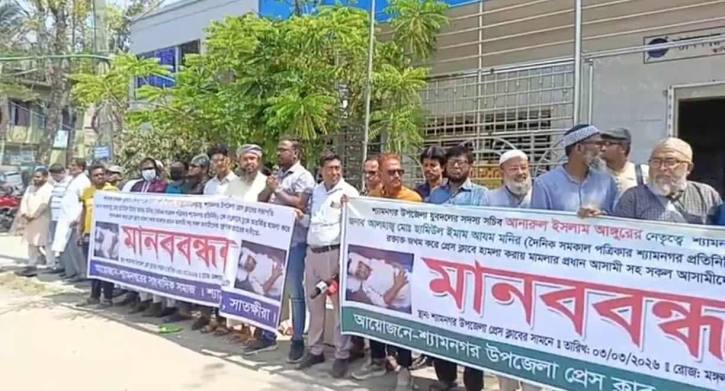 মঙ্গলবার (৩ মার্চ) বেলা ১১টায় উপজেলা প্রেসক্লাব চত্বরে শ্যামনগর উপজেলা প্রেসক্লাব ও শ্যামনগর সাংবাদিক সমাজের যৌথ উদ্যোগে এ মানববন্ধন অনুষ্ঠিত হয়। উপজেলা প্রেসক্লাবের সহযোগী সদস্য আব্দুল আহাদের সঞ্চালনায় আয়োজিত কর্মসূচিতে বিভিন্ন সাংবাদিক সংগঠনের নেতৃবৃন্দ বক্তব্য রাখেন।