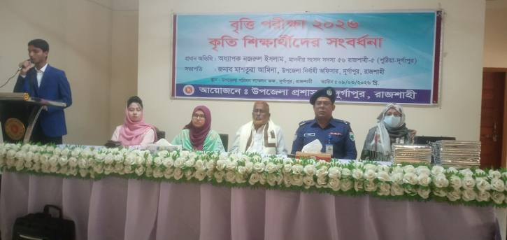 রাজশাহী দুর্গাপুরে উপজেলা প্রশাসনের আয়োজনে সোমবার বিকেলে বৃত্তি পরিক্ষা ২০২৬ কৃতি শিক্ষার্থীদের সংবর্ধনা প্রদান করা হয়েছে।