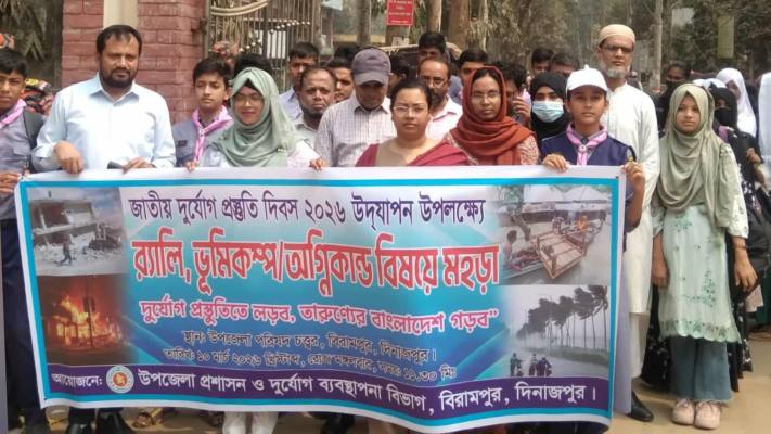 “দুর্যোগ প্রস্তুতিতে লড়বো, টেকসই বাংলাদেশ গড়বো”—এই প্রতিপাদ্যকে সামনে রেখে দিনাজপুরের বিরামপুরে জাতীয় দুর্যোগ প্রস্তুতি দিবস ২০২৬ উপলক্ষে র‍্যালি, ভূমিকম্প ও অগ্নিকাণ্ড বিষয়ক মহড়া অনুষ্ঠিত হয়েছে।