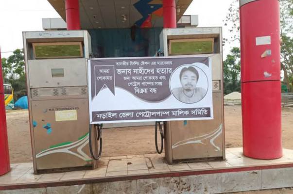 রোববার (২৯মার্চ) দুপুরে নড়াইল পাম্প মালিক সমিতি মিটিং শেষে পাম্প বন্ধ ঘোষণা করেছে। নড়াইল পাম্প মালিক সমিতির যুগ্ন-আহবায়ক সাইফুল ইসলাম হিটু বলেন,তুলরামপুরে মেসার্স তানভীর ফিলিং অ্যান্ড গ্যাস স্টেশনের ম্যানেজার নাহিদ সরদার হত্যার ঘটনায় আমরা জেলার ১০টি পাম্প এক দিনের জন্য বন্ধ ঘোষণা করা হয়েছে।