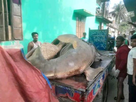 এমন একটি দল মঙ্গলবার ভোরে বঙ্গপসাগর থেকে ধরা এই বিশাল মাছটি নিয়ে আমুয়া মৎস্য বন্দরে আসেন।