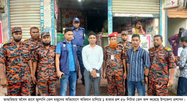পিরোজপুরের ভাণ্ডারিয়া উপজেলায় অবৈধভাবে জ্বালানি তেল মজুদের অভিযোগে অভিযান চালিয়ে ১ হাজার ৪৫৮ লিটার তেল জব্দ করেছে উপজেলা প্রশাসন। এ ঘটনায় এক ব্যবসায়ীকে ১০ হাজার টাকা জরিমানা করা হয়েছে।